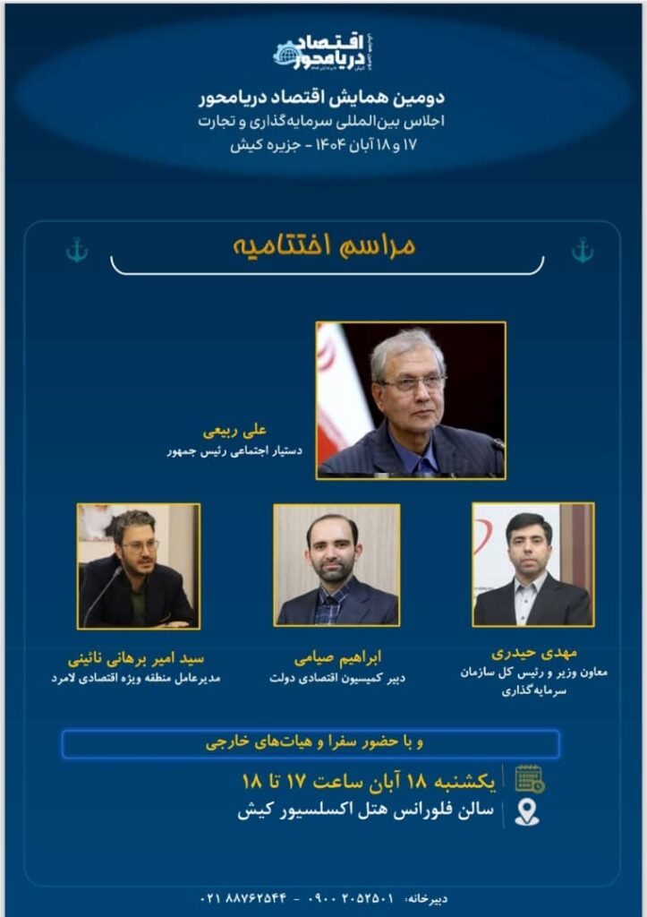 علی ربیعی (دستیار اجتماعی رییس جمهور)، ابراهیم صیامی (دبیر کمیسیون اقتصادی دولت) و مهدی حیدری (معاون وزیر و رئیس کل سازمان سرمایهگذاری) از دیگر سخنرانان مراسم اختتامیه این همایش در جزیره کیش هستند.